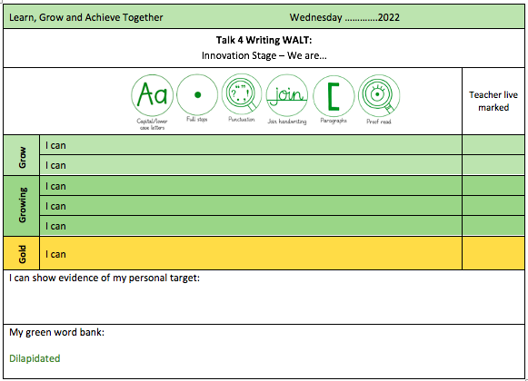 WALT Headings give clear objectives and self-assessment tools for each piece of work.