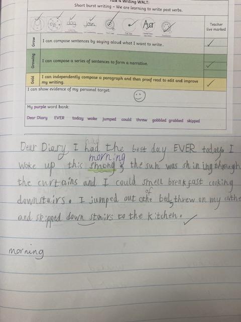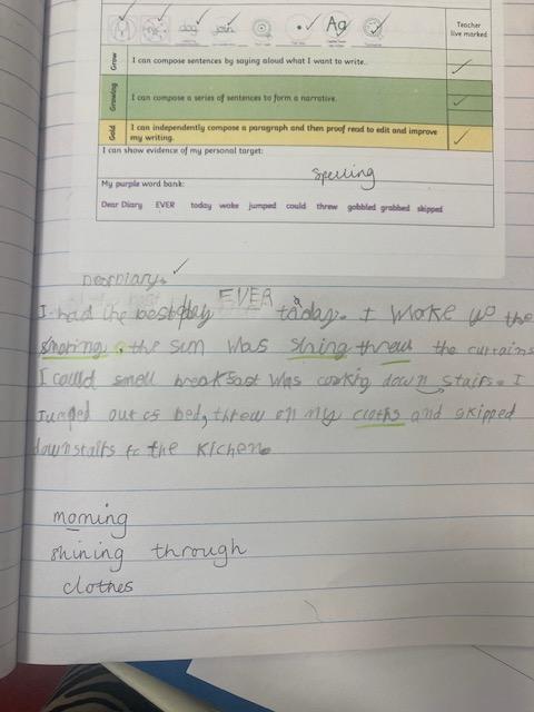 To encourage children to self-check, edit, and improve their own work, we use a ‘live marking’ approach. Children across the school are taught how to use a variety of self-help strategies including: success criteria, writing toolkits, word banks and model texts. Once children’s work has been discussed/marked, they can make further improvements using a purple ‘polishing’ pen.